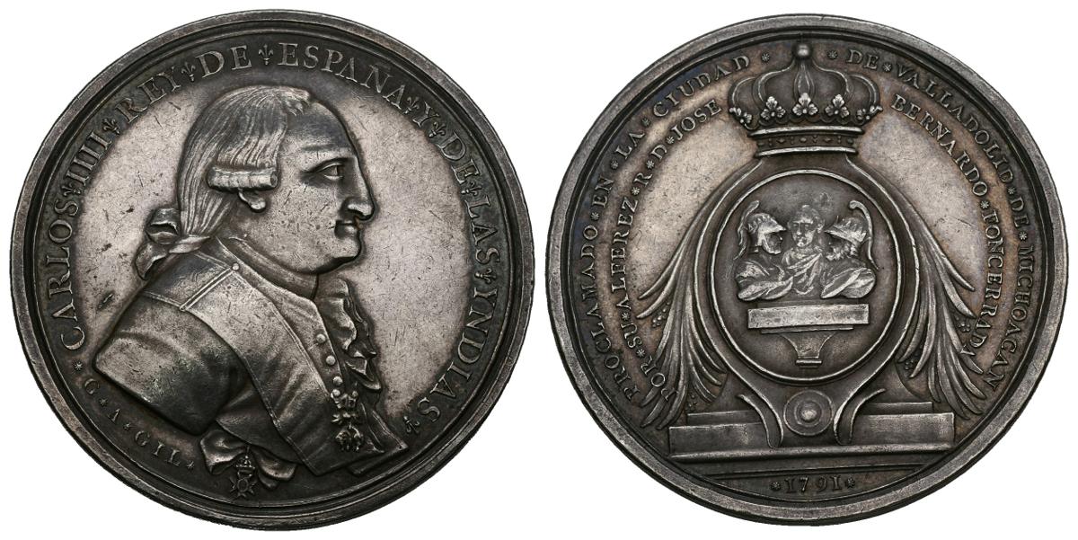 CARLOS IV (1788-1808). Proclamación en Valladolid de Michoacan, México. (Ae. 42,88g/45mm). 1791. Grabador: G.A. Gil. (Vives 172; RAH 435 variación de metal). Anv: Busto de Carlos IV con casaca, camisa chorrera, banda, manto y los collares del toisón y Espíritu Santo, alrededor leyenda: CARLOS IIII REY DE ESPAÑA Y DE LAS YNDIAS. Rev: Escudo oval conronado con tres bustos sobre repisa y adorno exterior formado por cartones y dos palmas, alrededor leyenda: PROCLAMADO EN LA CIUDAD DE VALLADOLID DE MICHOACAN/POR SU ALFEREZ R D JOSE, en exergo: 1791. MBC+. Ligero tono irisado. Escasa.