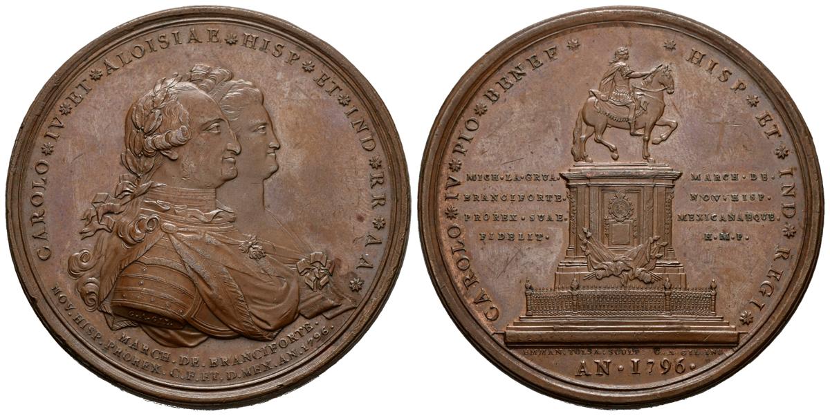 CARLOS IV (1788-1808). Monumento a Carlos IV. (Ae. 124,61g/60mm). 1796. México. Grabador: G. A. Gil. (Vives 186; RAH 439). Anv: Bustos acodados de Carlos IV, laureado con casaca, manto y el collar del toisón, y de la reina, con diadema y traje de corte, alrededor leyenda: CAROLO IV ET ALOISIAE HISP ET IND RR AA/MARCH DE BRACIFORTE/NOV HISP PROREX C F ET D MEZ AN 1796. Rev: Estatua ecuestre de Carlos IV sobre pedestal, debajo trofeos militares, a ambos lados leyenda: MICH LA GRUA-MARCH DE/BRANCIFORTE-NOV HISP/PROREX SUAE-MEXICANAEQUE/FIDELIT-H M P, alrededor leyenda: CAROLO IV PIO BENEF HISP ET IND REGI, en exergo: EMMAN TOLSA SCULP G A GIL INV/AN 1796. EBC. Escasa.