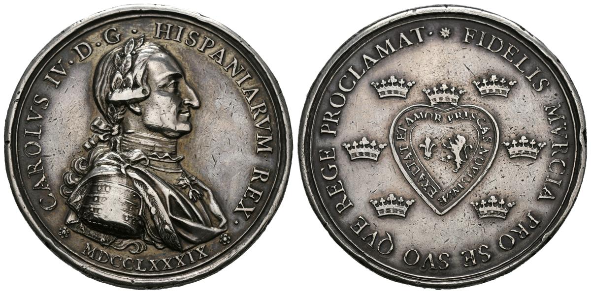 CARLOS IV (1788-1808). Proclamación en Murcia. (Ar. 22,01g/39mm). 1789. Grabador: M. Peleguer y Tossar. (H-76; VQ 13130). Anv: Busto laureado de Carlos IV con coraza, banda, manto y collar del toisón, alrededor leyenda: CAROLVS IV D G HISPANIARVM REX, debajo del busto: MDCCLXXXIX. Rev: Escudo con forma de corazón coronado, con flor de lis y leon rampante a izquierda dentro, en el borde: PRISCAS NOVISIMAE EXALTAT ET AMOR, seis coronas rodeando el escudo, alrededor leyenda: FIDELIS MVRCIA PRO SE SVO QVE REGE PROCLAMAT. MBC+. Limpiada. Bonito tono. Rara.