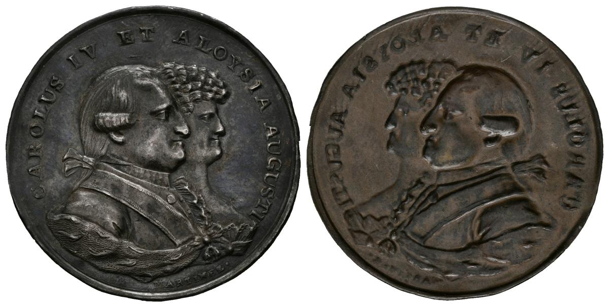 CARLOS IV (1788-1808). Proclamación en Soria. (Bronce plateado 1,03/29mm). 1789. Grabador: A. Martínez. Módulo de 4 Reales. Prueba unifaz. Anv: Bustos de Carlos IV, con casaca, camisa con chorrera, banda, manto y collar del toisón, y de la reina, con traje de corte, alrededor leyenda: CAROLUS IV ET ALOYSIA AUGUSTI. EBC.