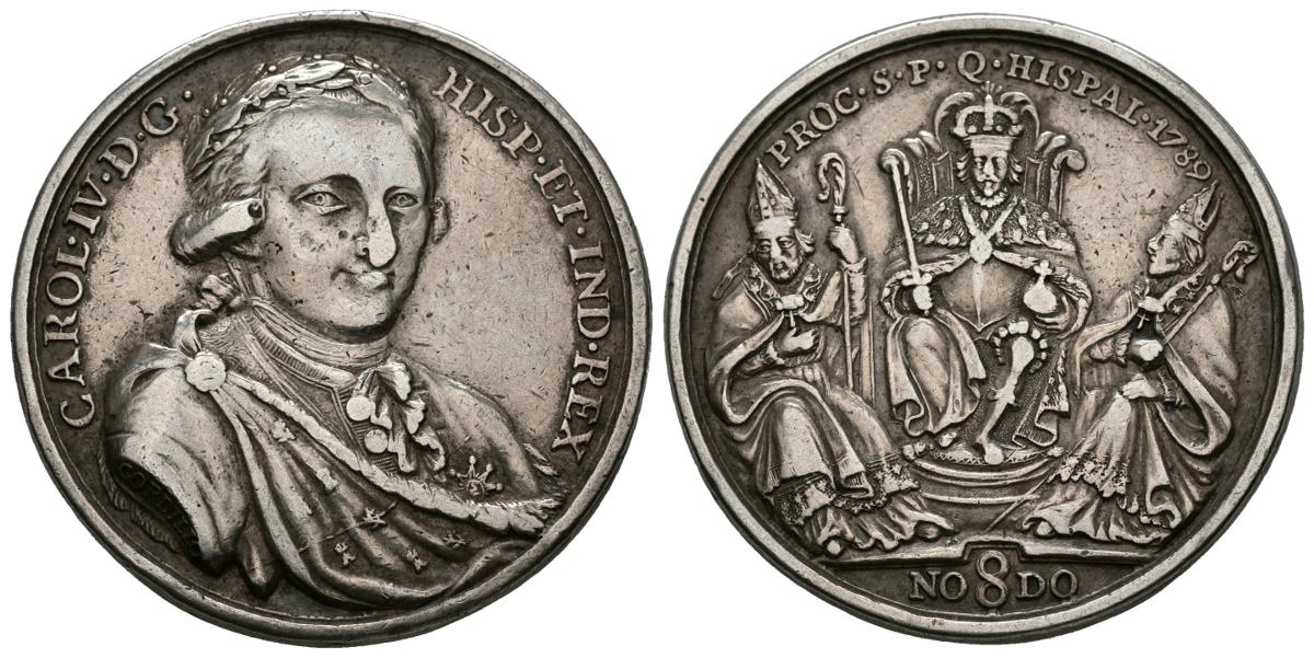 CARLOS IV (1788-1808). Proclamación en Sevilla. (Ar. 23,78g/35mm). 1789. Grabador: F. Gordillo. (Vives 98; RAH 386). Anv: Busto semifrontal de Carlos IV laureado con casaca, camisa con chorrera, banda, manto y la cruz del Santo Espíritu, alrededor leyenda: CAROL IV D G HISP ET IND REX. Rev: San Fernando coronado con armadura, manto, espada y globo crucífero, entre San Isidoro y San Leandro ambos con mitra y báculo, encima leyenda: PROC S P Q HISPAL 1789, en exergo: NO-8-DO. MBC. Limpiada.