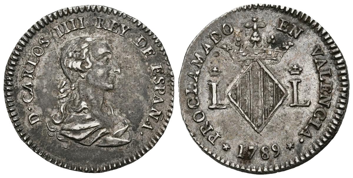CARLOS IV (1788-1808). Proclamación en Valencia. (Ar.3,63g/23mm). 1789. Módulo de 2 Reales. (Vives 698; RAH 396). Anv: Busto drapead de Carlos IV, alrededor leyenda: D CARLOS IV REY DE ESPAÑA. Rev: Escudo coronado con murciélago en losange y las armas de la ciudad, entre L coronadas, alrededor leyenda: PROCLAMADO EN VALENCIA. EBC-. Preciosa pátina.