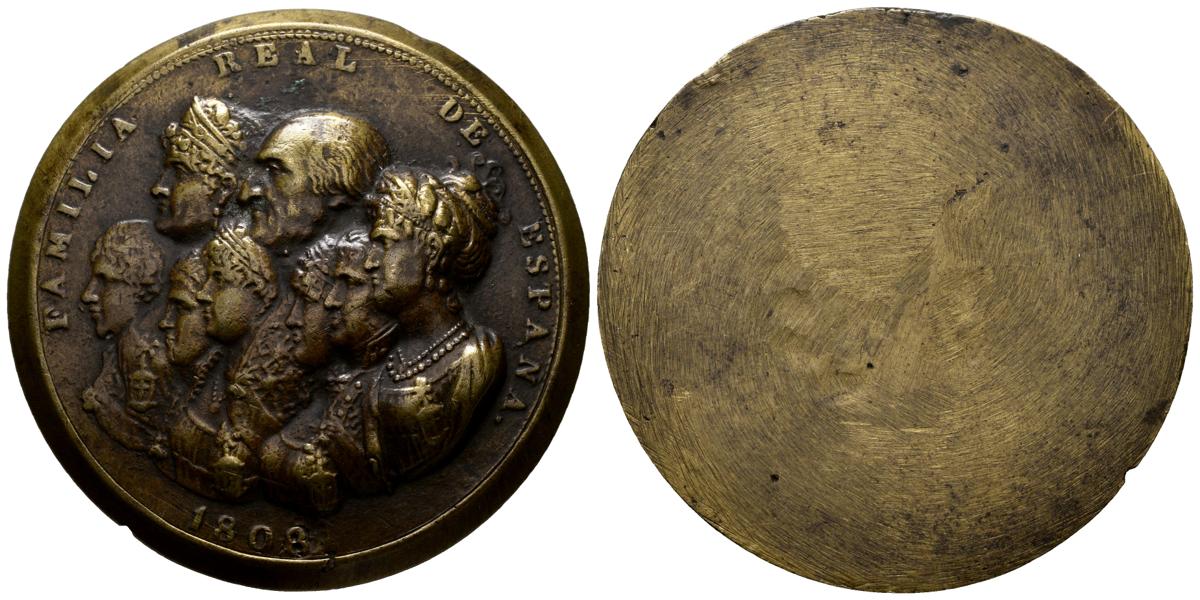 CARLOS IV (1788-1808). Familia Real de España. (Ae. 81,44g/64mm). 1808. Medalla unifaz. Grabador: ¿Paroy?. (Bramsen-720). Anv: Bustos acodados de Maía Luisa y Carlos IV con los infantes Carlos Mª Isidro, Francisco de Paula, Maía Luisa, María Isabel, Fernando y Carlota Joaquina a izquierda, alrededor leyenda: FAMILIA REAL DE ESPAÑA 1808. MBC+. Rara.
