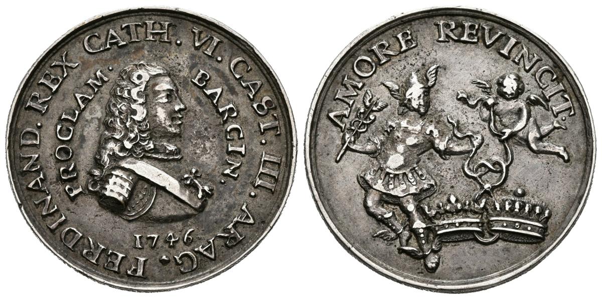 FERNANDO VI (1746-1759). Proclamación en Barcelona. (Ar. 5,15g/27mm). 1746. Módulo de 2 Reales. Grabador: I. Valls. (Vives 669). Anv: Busto de Fernando VI con coraza, banda y collar de toisón, alrededor leyenda: FERDINAND REX CATH VI CAST III ARAG/PROCLAM BARCIN 1746. Rev: Mercurio a izquierda con petaso y caduceo, ayuda a Cupido a unir con un lazo las dos coronas usadas por los reyes de Castilla y Aragón, encima leyenda: AMORE REVINCIT. MBC+. Escasa.