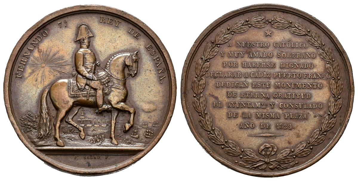 FERNANDO VII (1808-1833). Cádiz en gratitud por haber declarado la ciudad puerto franco. (Ae. 28,32g/41mm). 1829. Grabador: F. Sagau. (Vives 359). Anv: Fernando VII con uniforme militar y cetro, a caballo al paso, al fondo la ciudad de Cádiz y en el cielo el Sol radiante, encima leyenda: FERNANDO 7º REY DE ESPAÑA. Rev: Leyenda: A NUESTRO CATOLICO/Y MUY AMADO SOBERANO/POR HABERSE DIGNADO/DECLARAR A CADIZ PUERTO FRANCO/DEDICAN ESTE MONUMENTO/DE ETERNA GRATITUD/EL AYUNTAMTO/DE LA MISMA PLAZA/AÑO DE 1829, dentro de láurea. EBC-. Golpecitos en el canto.