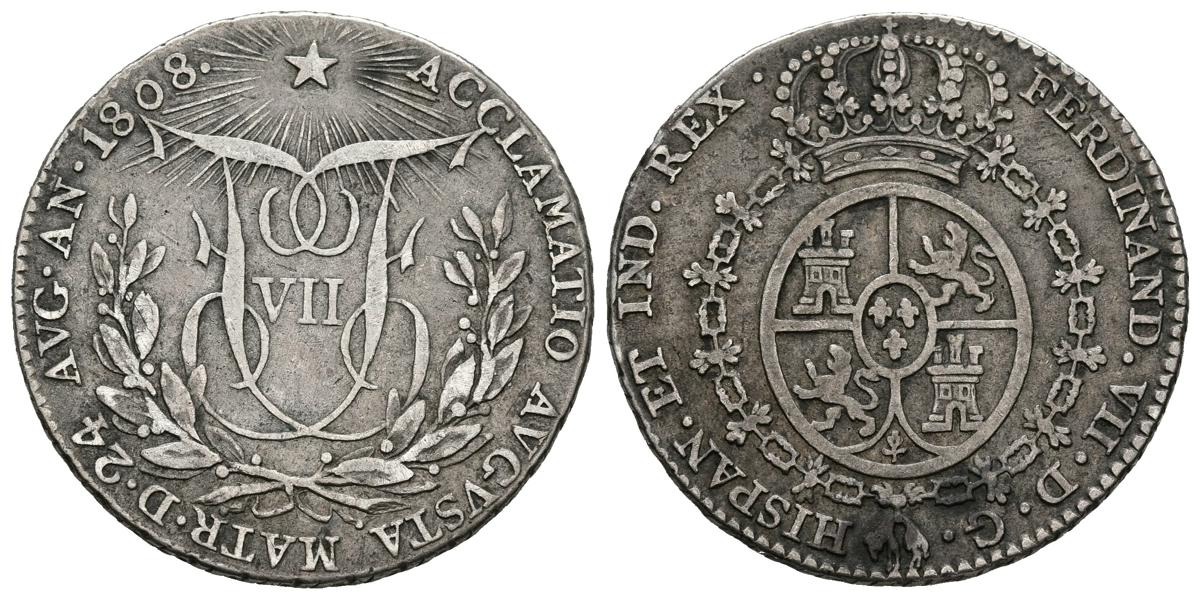 FERNANDO VII (1808-1833). Proclamación en Madrid. (Ar.5,71g/25mm). 1808. Módulo de 2 Reales. (Vives 200). Anv: Escudo de España rodeado de collar del toisón, alrededor leyenda: FERDINAND VII D G HISPAN ET IND REX. Rev: Iniciales de Fernando VII, debajo láurea, encima estrella, alrededor leyenda: ACCLAMATIO AVGVSTA MATR D 24 AVG AN 1808. MBC/MBC+