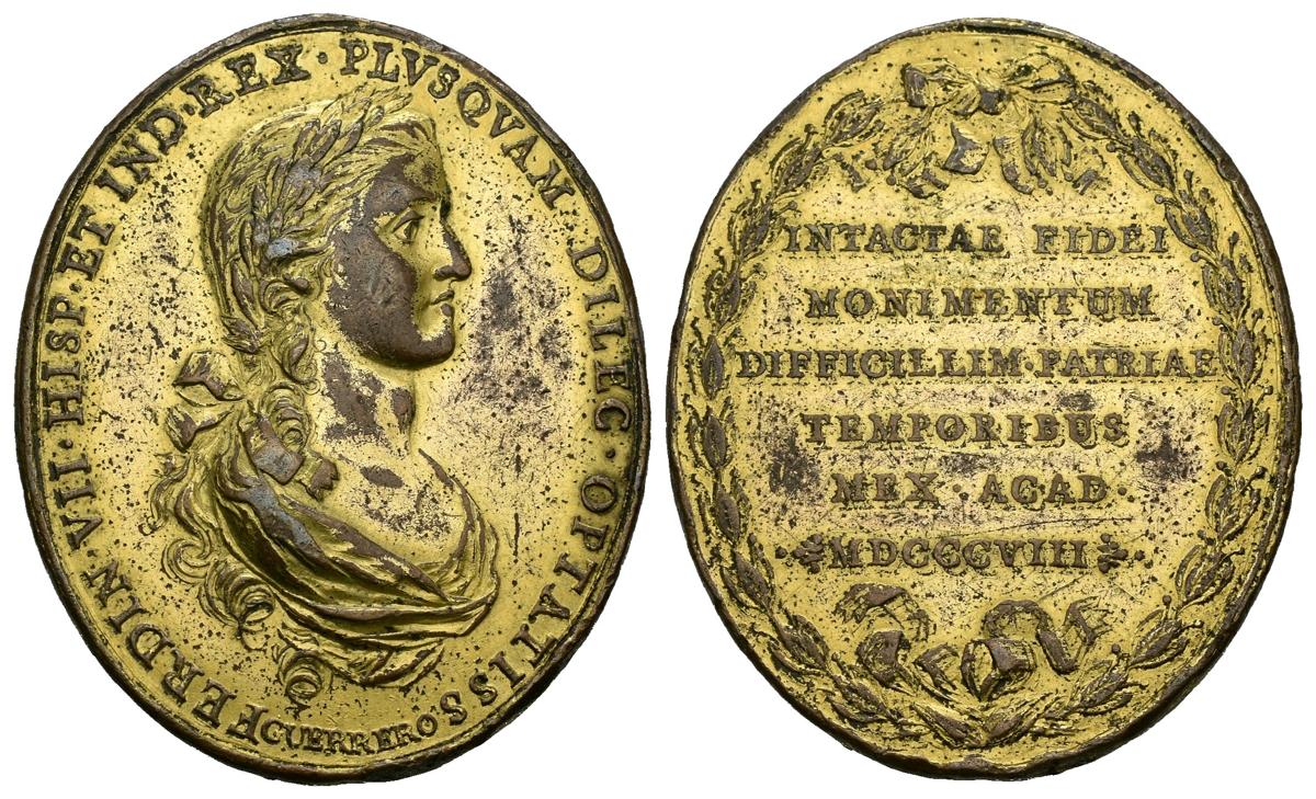 FERNANDO VII (1808-1833). Medalla Proclamación en México. (Ae.-sobredorado. 28,79g/37mm). Medalla ovalada. 1808. Grabador: J.M. Guerrero. (Vives 231; H-36). Anv: Busto laureado de Fernando VII con manto, alrededor leyenda: FERDIN VII HISP ET IND REX PLVSQVAM DILEC OPTATISS. Rev: Leyenda: INTACTAE FIDEI/DIFFICILLIM PATRIAE/TEMPORIBUS/MEX ACAD/MDCCCVIII, todo dentro de láurea dornada con grandes lazos. MBC+. Escasa.