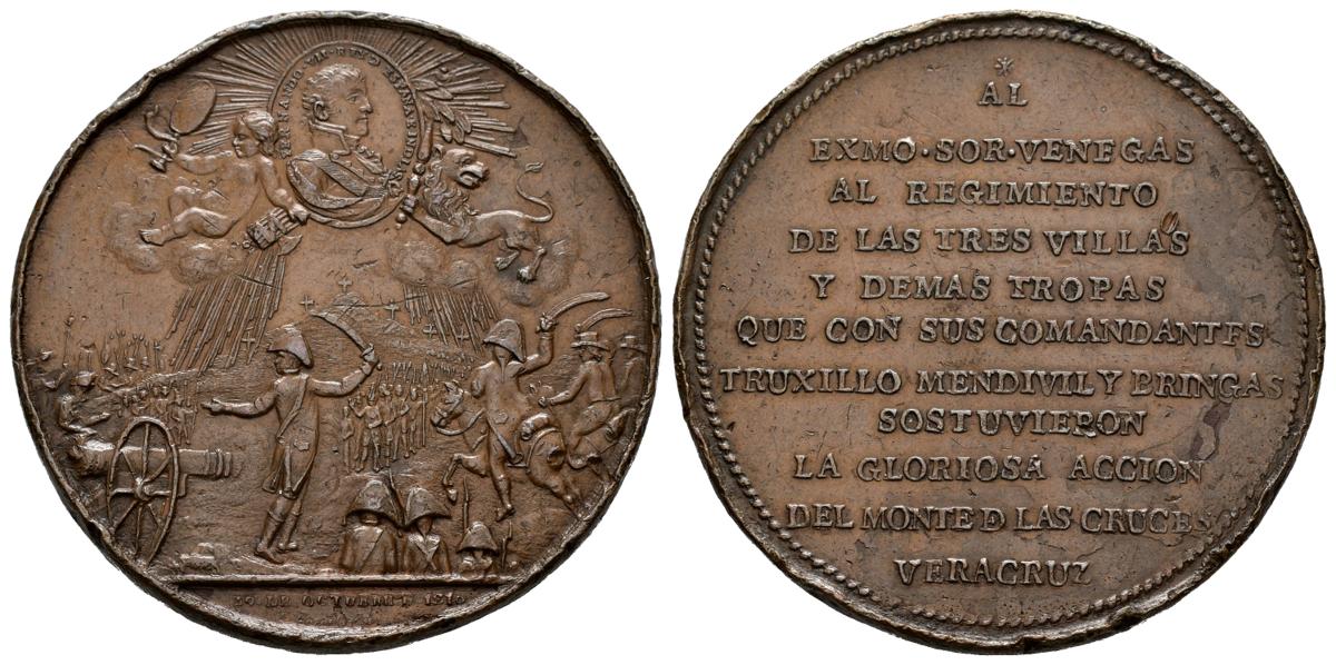 FERNANDO VII (1808-1833). Batalla del Monte de las Cruces. (Ae. 53,43g/52mm). 30 de Octubre de 1810. Toluca, México. Grabador: F. Gordillo. (Vives 285). Anv: Ejército atacando un cerro con varias cruce, encima escudo refulgente con el busto del rey y la leyenda: FERNANDO VII REY D ESPAÑA E INDIAS, sostenido por un león con cetro y un genio que porta haz y espejo on una serpiente erollada, sobre nubes, en exergo: 30 DE OCTUBRE D 1810. Rev: Leyenda: AL/EXCMO SOR VENEGAS/ AL REGIMIENTO/DE LAS TRES VILLAS/Y DEMAS TROPAS/QUE CONS SUS COMANDANTES/TRUXILLO MENDIVIL Y BRIGAS/SOSTUVIERON/LA GLORIOSA ACCION/DEL MONTE D CRUCES/VERACRUZ. MBC+. Golpes en el canto.