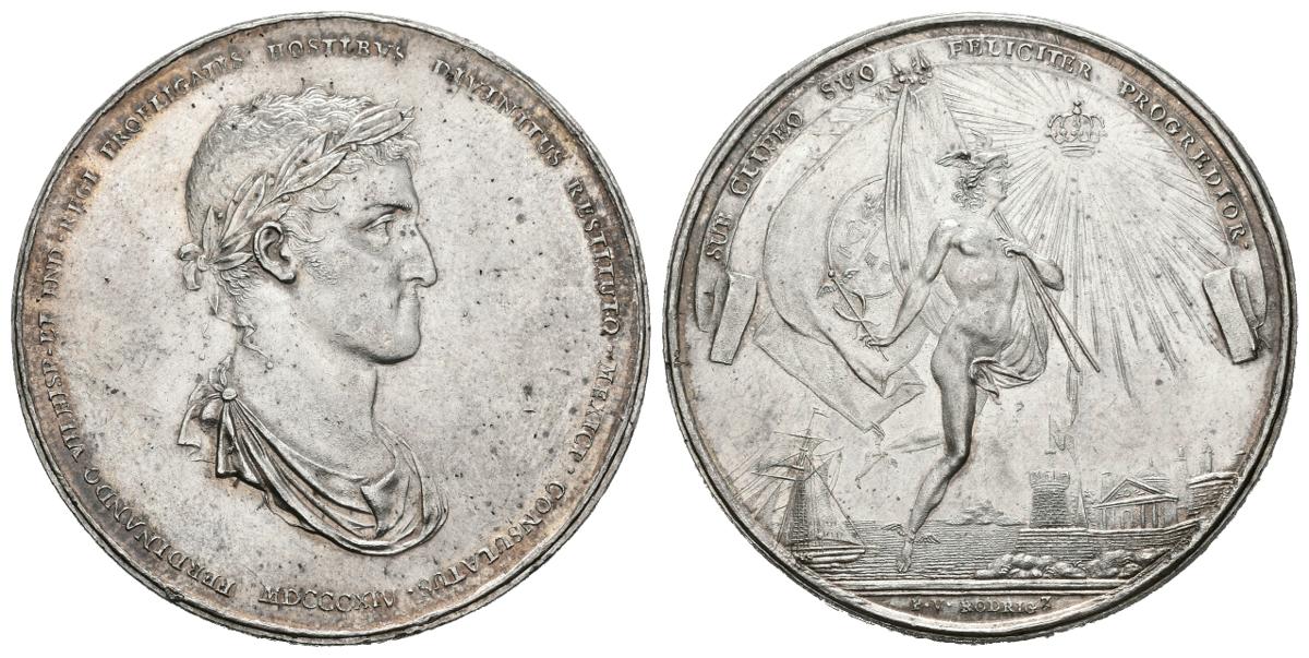 FERNANDO VII (1808-1833). Restitución al trono. Consulado de México. (Ar. 52,45g/45mm). 1814. Grabador: P.V. Rodriguez. (Vives 315). Anv: Busto laureado de Fernando VII con manto, alrededor leyenda: FERDINANDO VII HISP ET IND REGI PROFLIGATIS HOSTIBVS DIVINITUS RESTITUTO MEXICI CONSULATUS, debajo del busto: MDCCCXIV. Rev: Mercurio en marcha, mirando una corona real radiante de luz, con caduceo e la mano derecha y dos estandartes sobre el hombro izquierdo, uno de los caules lleva bordado el escudo del Consulado, debajo, al fondo, vista de una ciudad costera amorallada y una nave, encima banda superior con leyenda: SUB CLIPEO SUO FELICITER PROGREDIOR, en exergo: P V RODRIGZ. EBC-/EBC. Bonito y raro ejemplar.