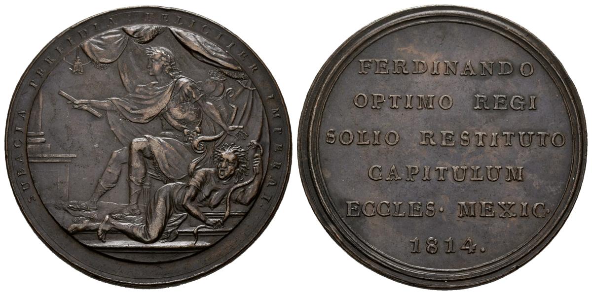 FERNANDO VII (1808-1833). Restitución en el Trono. (Ae. 57,58g/52mm). 1814. México. Grabador: José Guerrero. (Vives 310). Anv: Leyenda: FERDINANDO/OPTIMO REGI/SOLIO RESTITUTO/CAPITULUM/ECCLES MEXIC/1814, dentro de doble orla lineal. Rev: Fernando VII laureado y vestido con traje romano sentado en el trono con cetro en la mano derecha, a sus pies Furia estrangulando a una serpiente, al fondo, columna y pedestal. MBC+. Leves golpecitos en el canto.