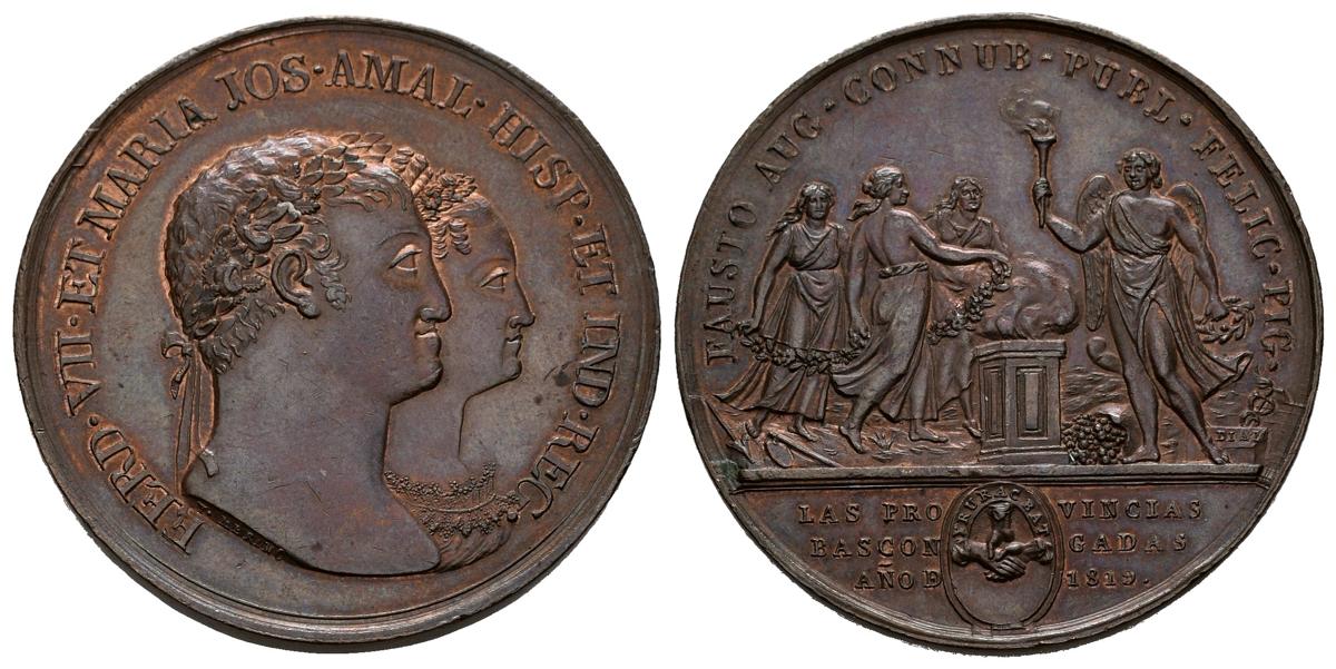 FERNANDO VII (1808-1833). Boda de Fernando VII y María Josefa Amalia. (Ae. 42,96g/38mm). 1819. Homenaje de las Provincias Vascongadas. (Vives 332 variante en metal). Anv: Bustos de Fernando VII y María Josefa Amalia a derecha, alrededor leyenda: FERD VII ET MARIA JOS AMAL HISP IND REG. Rev: Ara central encendida, a la derecha figura alada con una antorcha y corona de laurel, a la izquierda tres figuras femeninas con guirnalda, encima leyenda: FAUSTO AUG CANNUB PUBL FELICI PIG, en exergo: óvalo con tres manos unidas, a ambos lados leyenda: LAS PRO-VINCIAS/BASCON-GADAS/AÑO D-1819. EBC.
