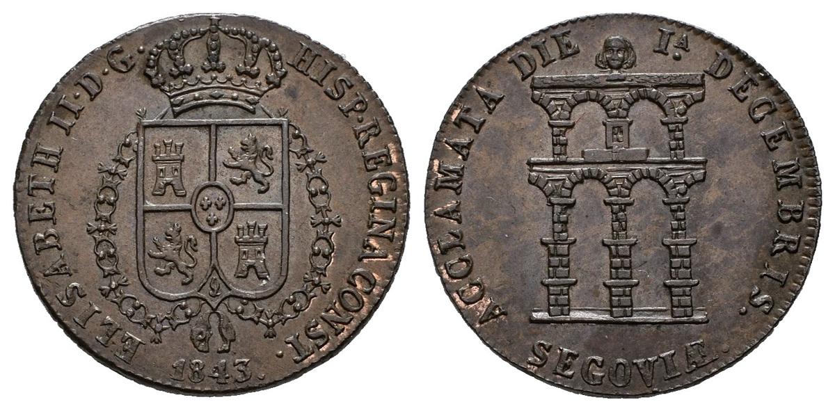 ISABEL II (1833-1868). Mayoría de Edad de la Reina. (Ae. 5,09g/23mm). 1843. Segovia. (Vives 790 variación de metal). EBC-.