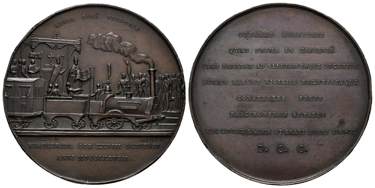 ISABEL II (1833-1868). Inauguración del Ferrocarril Barcelona-Mataró. (Ae. 78,51g/52mm). 1848. Grabadores y diseño: Lorenzale y Jubany. (RAH-602). EBC-. Golpe en el canto.El 28 de octubre de 1848, veinte días después de su primer viaje y por motivos de agenda, se inaugura el primer ferrocarril de uso público de la península. Especificamos lo de península pues el primer ferrocarril español se había puesto en circulación en 1839 en la isla de Cuba, en el tramo La Habana-Bejucal. Aun así, el Barcelona-Mataró es considerado uno de los iconos del inicio del proceso industrializador en España y supuso el primer paso en la extensión de la red ferroviaria en España que prosiguió en la década de los 50 con la línea Madrid-Aranjuez, la Barcelona-Granollers y la Xátiva-Valencia entre otras.