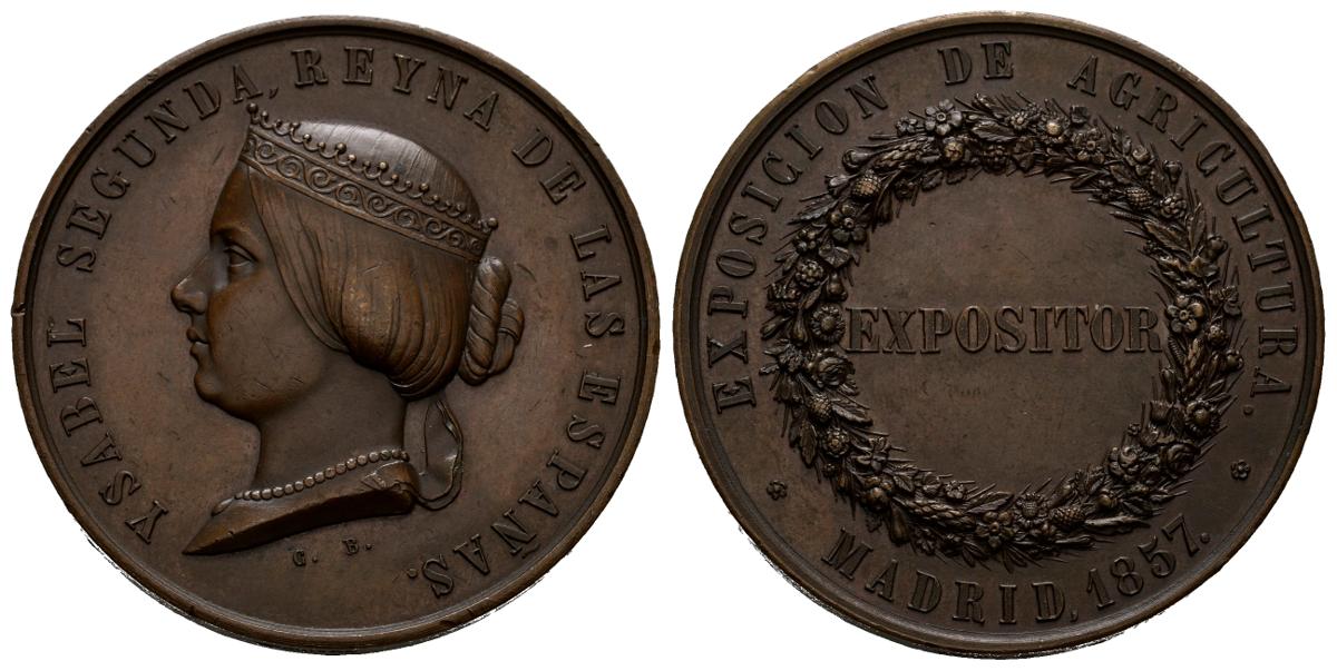 ISABEL II (1833-1868). Exposición de Agricultura. (Ae. 39,61g/43mm). 1857. Madrid. Grabador: Louis Charles Bouvet. En el canto grabado Cuivre (Colección Medallas Españolas, Vol II, Nº 684). EBC.