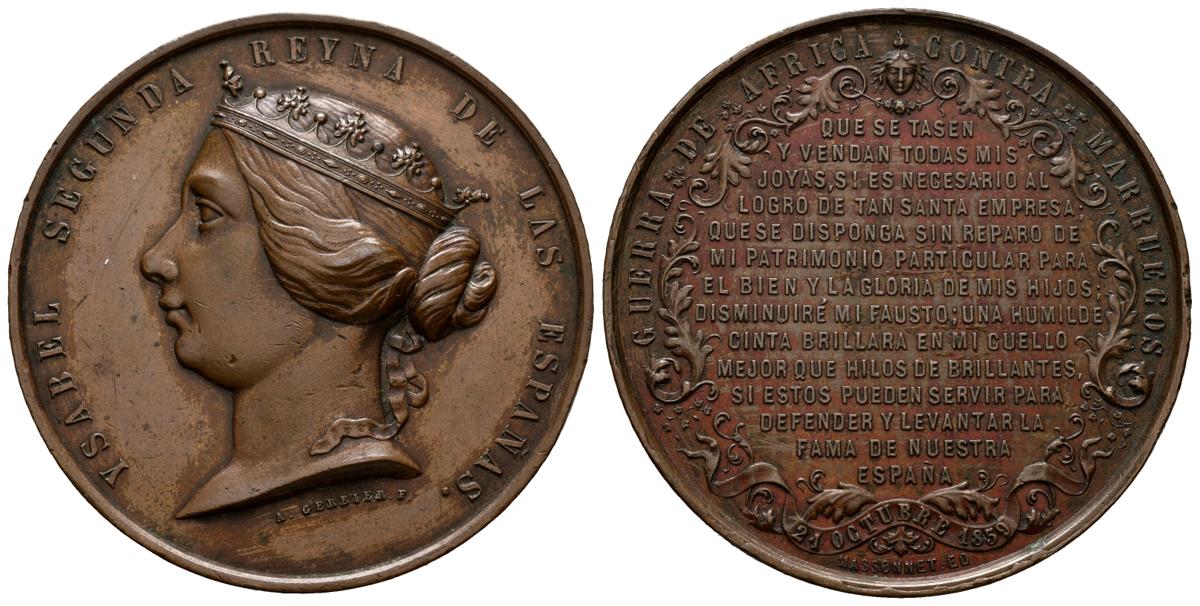 ISABEL II (1833-1868). Guerra de África. Cesión de Patrimonio Real para la ayuda a los gastos de la Guerra de África. (Ae. 92,12g/58mm). 1859. Grabador:. A. Gerbier y Massonet. (Vives-416). MBC+.
