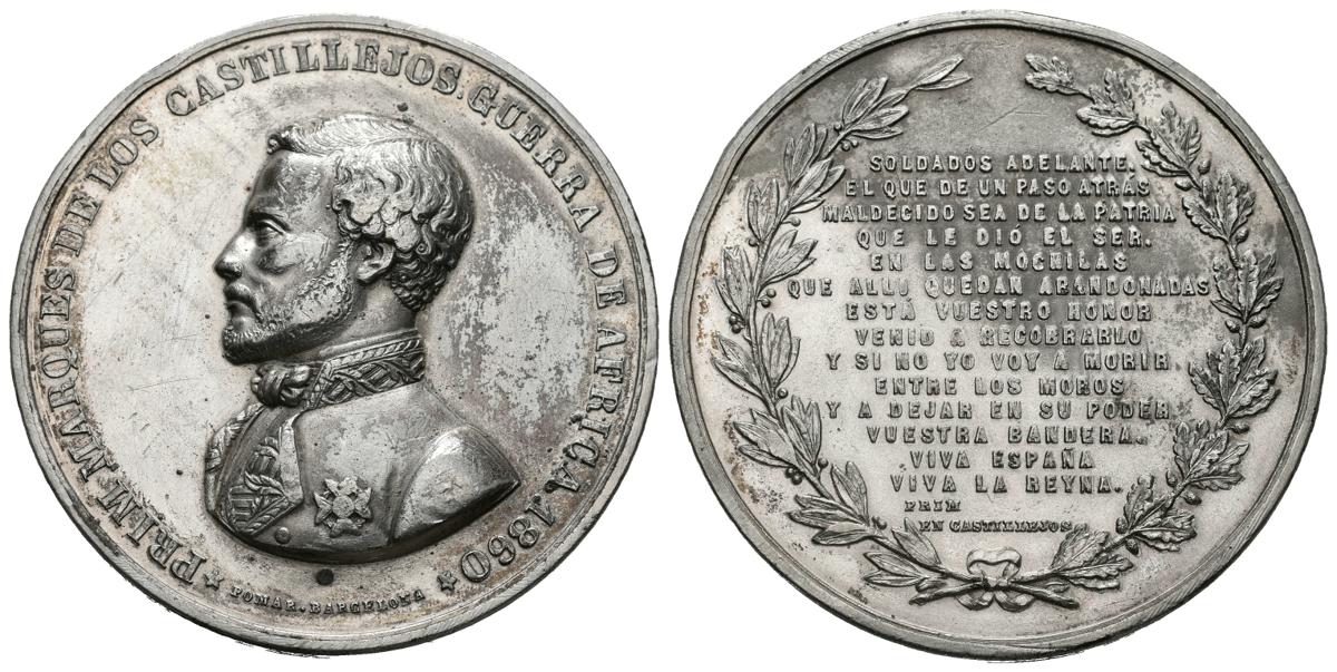 ISABEL II (1833-1868). Prim Marqués de los Castillejos. Guerra de África. (Calamina plateada. 68,80g/54mm). 1860. Barcelona. Grabador: Pomar. (Vives 809). MBC+.