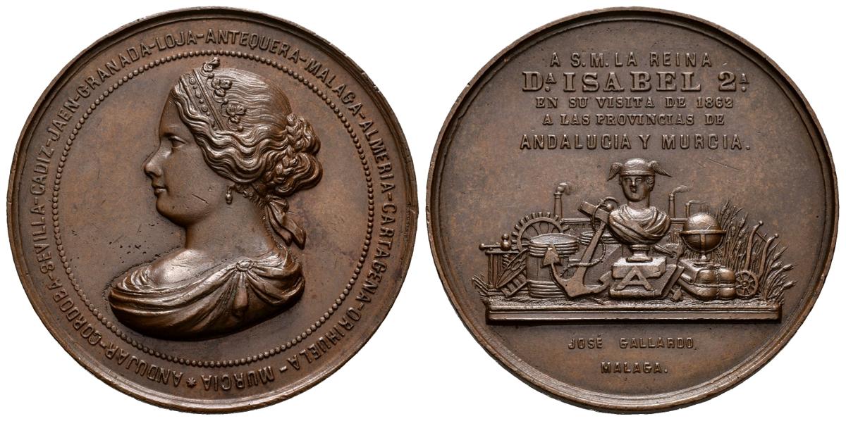 ISABEL II (1833-1868). Visita de la Reina a las Provincias de Andalucía y Murcia. (Ae. 54,14g/50mm). 1862. Acuñada en Málaga por José Gallardo. (Vives 428 variación de metal). EBC-. Leves golpecitos en el canto. Rara así.