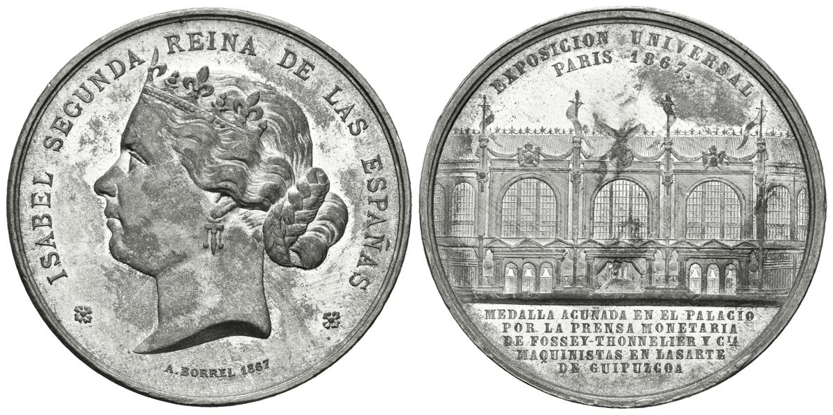 ISABEL II (1833-1868). Exposición Universal de París. (Metal blanco. 49,77g/50mm). 1867. Acuñada en Lasarte, Guipuzcoa. Grabador: A. Borrel. (Vives 813). EBC-.