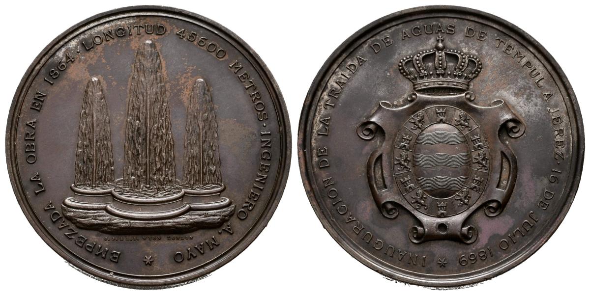 ISABEL II (1833-1868). Traída de aguas de Tempul a Jerez. (Ae. 55,63g/44mm). 1864-1869. Pieza acuñada en Londres. Grabadores: J.S. y A.B.Wyon. (Vives 454). EBC+.