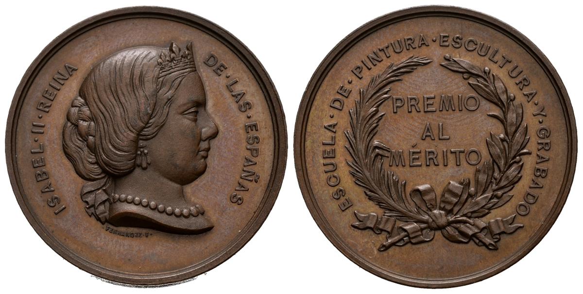 ISABEL II (1833-1868). Premio al Mérito. Escuela de Pintura, Escultura y Grabado. (Ae. 15,30g/34mm). S/D. Grabador: Fernádez. F. (Anverso como Vives 812). EBC.