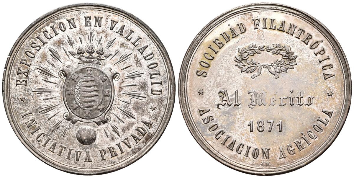 AMADEO I (1871-1873). Sociendad Filantrópica. Asociación Agrícola. Al Mérito. (Ar. 30,61g/39mm). 1871. Valladolid. Grabador: J.H. (RAH no cita; Patrimonio Nacional no cita). EBC. Restos de brillo original.