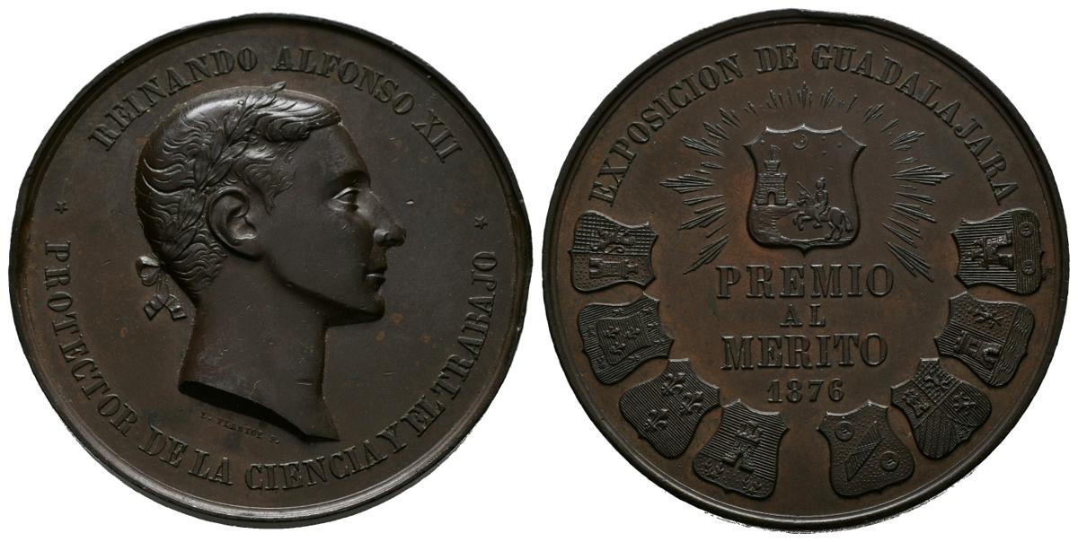 ALFONSO XII (1874-1885). Exposición de Guadalajara. Premio al Mérito. (Ae. 62,22/48mm). 1876. Grabador: L. Planiol. (Vives 467). EBC-. Leves golpecitos.