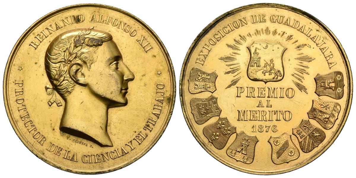 ALFONSO XII (1874-1885). Exposición de Guadalajara. Premio al Mérito. (Bronce sobredorado. 62,77g/48mm). 1876. Grabador: L. Plañiol. (Vives 466). EBC-. Marquitas.
