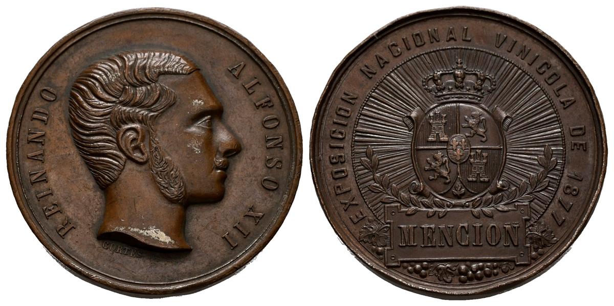 ALFONSO XII (1874-1885). Exposición Nacional Vinicola. Mención.(Ae.. 36,83g/41mm). 1877. Grabador: Cortés. (Vives 473). EBC-. Marquitas en anverso.