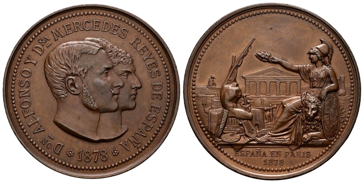 ALFONSO XII (1874-1885). Alfonso XII y María de las Mercedes en la Exposición Universal de París. (Ae. 57.35g/50mm). 1878. Grabador: Sala. (Vives 850). EBC+.