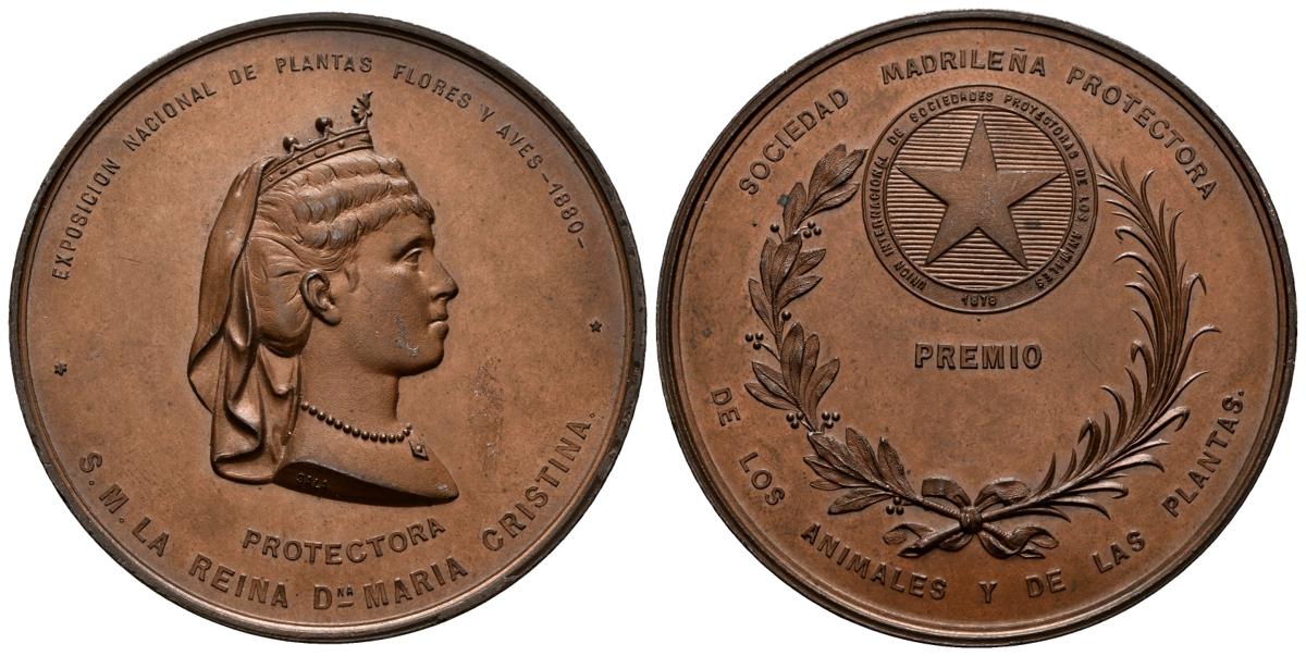 ALFONSO XII (1874-1885). Exposición de la Sociedad Madrileña Protectora de Animales y Plantas. (Ae. 97,28g/57mm). 1880. Grabador: Sala. (Vives 495). EBC-. Ligeros fallos en la gráfila del anverso.