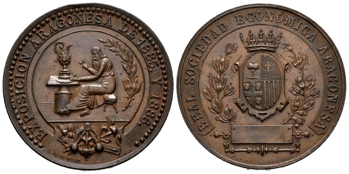 ALFONSO XIII (1885-1931). Exposición aragonesa de 1885 y 1886. (Ae.69,33g/53mm). Grabador: Fdo: F. Menéndez y Aguilar. (Vives 534 var). EBC-.