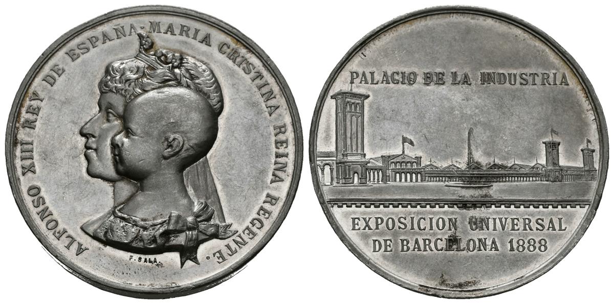 ALFONSO XIII (1885-1931). Exposición Universal de Barcelona. Palacio de la Industria. (Metal blanco. 64,41g/50mm). 1888. Grabador: Sala. (Cru. Medalles 762) . MBC+. Muy escasa.