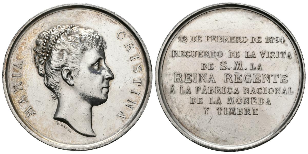 ALFONSO XIII (1885-1931). Visita de la Reina Regente María Cristina a la Fábrica Nacional de Moneda y Timbre. (Ar. 60,59g/50mm). 12 de Febrero de 1894. Madrid. Grabador: Bartolmé Maura. Leyenda en siete líneas. (RAH-735 variante de metal). EBC- Rayitas.
