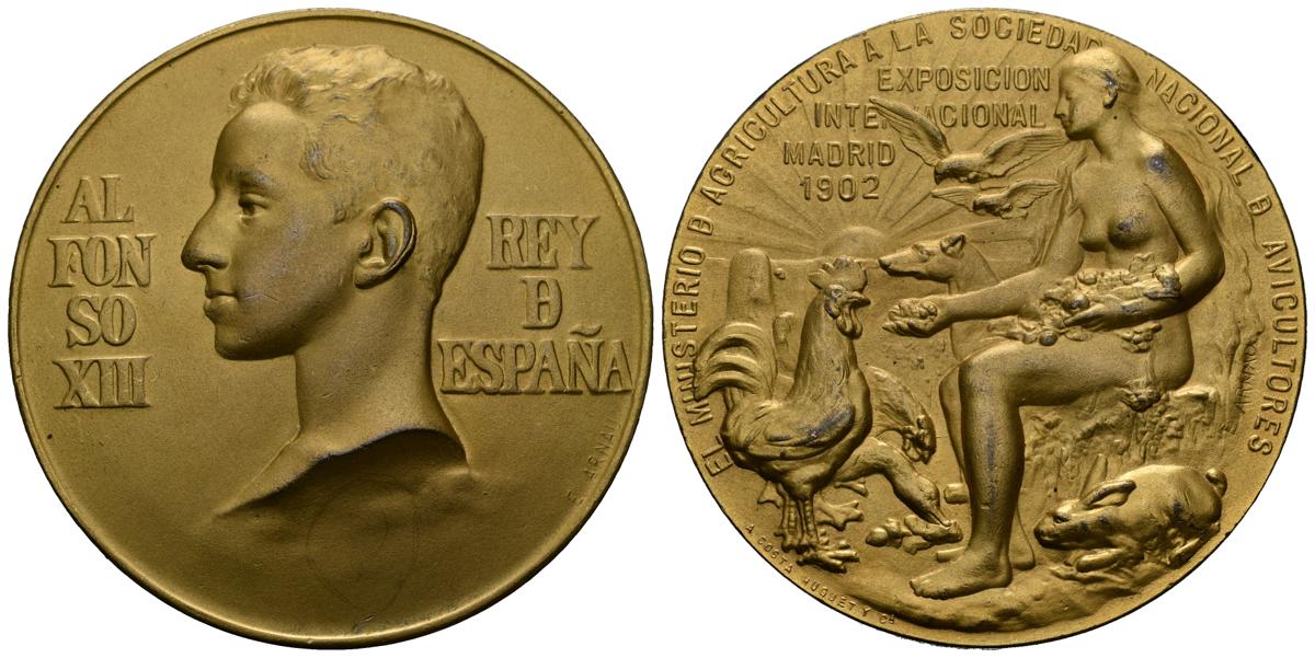 ALFONSO XIII. Exposición Internacional de Avicultura. (Ae. 108,96g/60mm). 1902. Madrid. Grabador: Eusebio Arnau yvA. Costa Hughet. EBC.