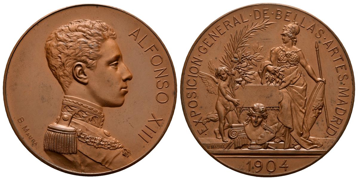 ALFONSO XIII (1885-1931). Exposición General de Bellas Artes. (Ae. 55,87g/49mm). 1904. Madrid. Grabador: B. Maura. (Vives 612). EBC+. Magnífica pieza.