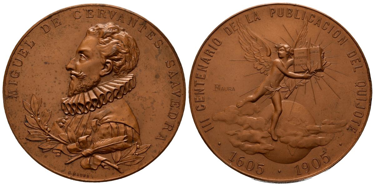 ALFONSO XIII (1885-1931). III Centenario de la Publicación del Quijote 1605-1905. (Ae. 95,06g/59mm). 1905. Grabador: Bartolomé Maura. (RAH 749). EBC-. Manchitas. Golpecito en el canto.