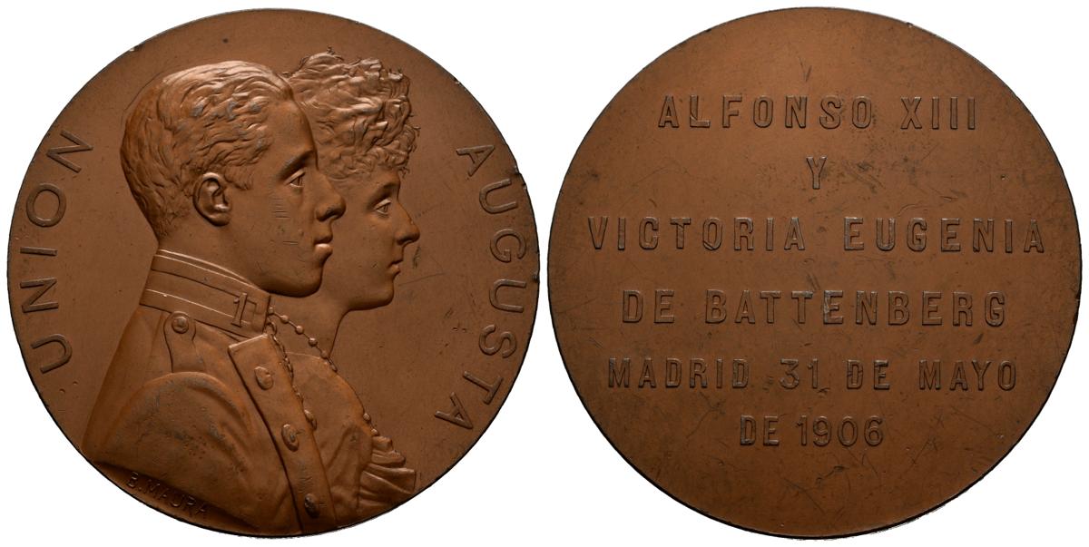 ALFONSO XIII (1885-1931). Unión Augusta. Enlace entre Alfonso XIII y Victoria Eugenia. (Ae. 79,78g/60mm). 31 de Mayo de 1906. Madrid. (RAH-757). EBC. Marquitas y leves muescas en el canto.