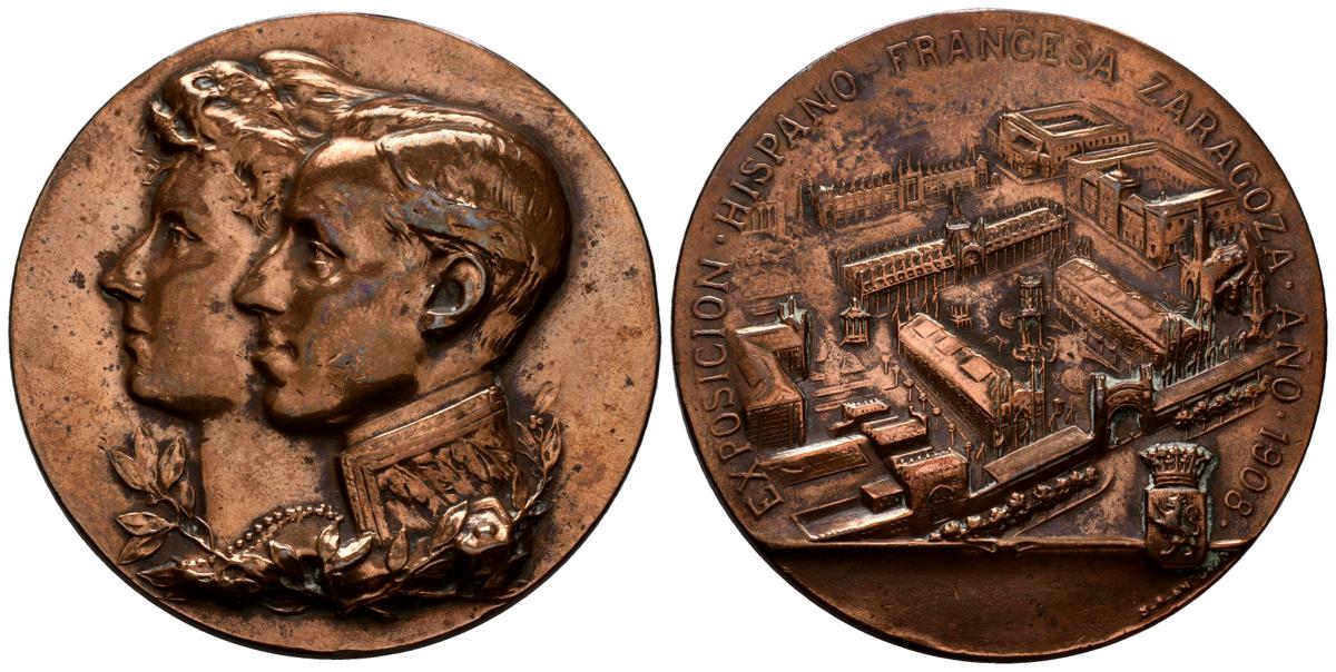 ALFONSO XIII (1885-1931). Exposición Hispano-Francesa de Zaragoza. (Ae. 101.32g/59mm). 1908. Grabador: S.A. Anduiza. (Vives 636 variante de metal). EBC-. Marquitas y leves golpes en el canto.