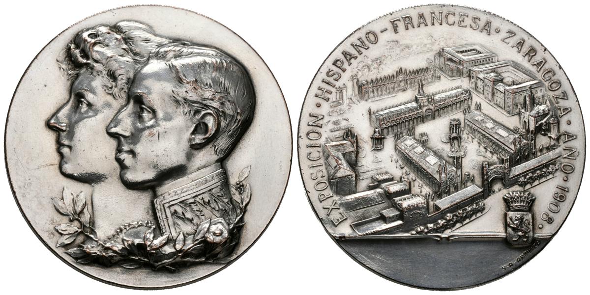 ALFONSO XIII (1885-1931). Exposición Hispano-Francesa de Zaragoza. (Bronce plateado. 107,61g/59mm). 1908. Grabador: S.A. Anduiza. (Vives 636 variante de metal). EBC.
