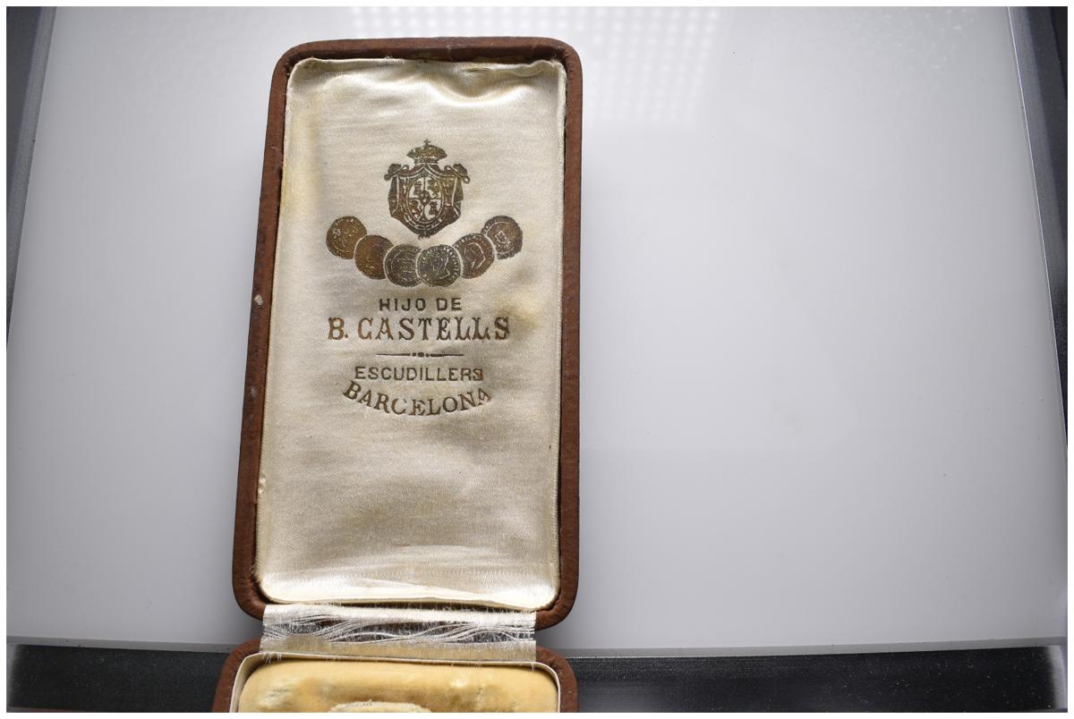 ALFONSO XIII (1885-1931). Exposición Internacional de Barcelona. Cooperación. (Ae. 27,03g/35mm). 1929. Grabador: Castells. (Cru. Medalles 1262a). Corona y cintaseparadas de la medalla. Incluye estuche original de Hijos de B. Castells. EBC. Escasa.