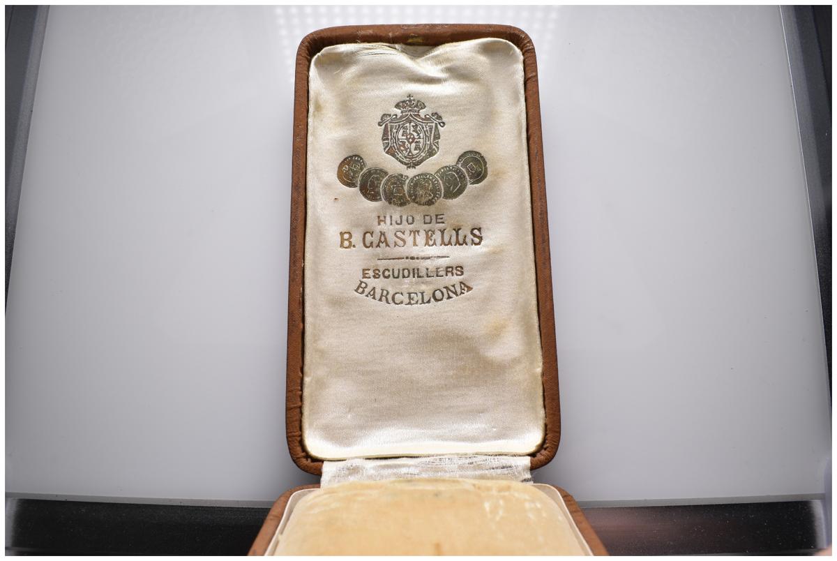 ALFONSO XIII (1885-1931). Exposición Internacional de Barcelona. Colaboración. (Ae-plateado. 41,64g/35mm). 1929. Grabador: Castells. (Cru. Medalles 1262a). Incluye corona, anilla y cinta ademas de estuche original de Hijos de B. Castells. EBC+. Escasa.La Exposición de 1929 supuso el aldabonazo definitivo para la modernización, especialmente urbanística, de Barcelona. El 19 de mayo de ese año, el rey, Alfonso XIII y la Reina Victoria Eugenia, tras el discurso del General Primo de Rivera que seguía al frente del directorio militar que gobernaba, daban por inaugurada dicha Exposición Internacional. La montaña de Montjuic fue la gran protagonista en esta ocasión, de la misma manera que el parc de la Ciutadella lo fue en la anterior de 1888.