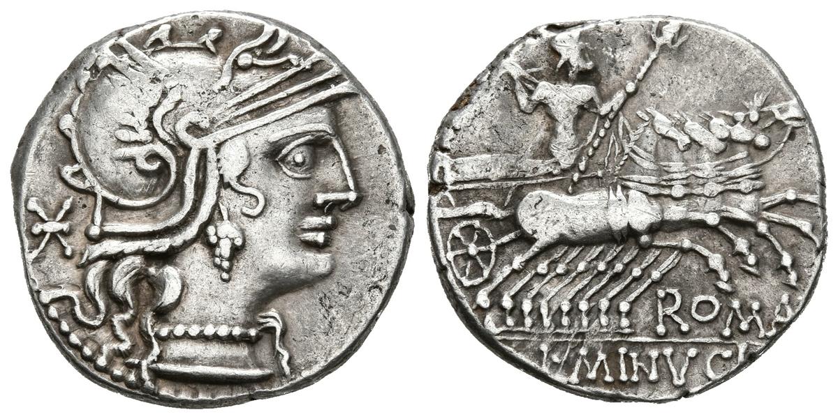 GENS MINUCIA. Denario. (Ar. 3,81g/19mm). 122 a.C. Taller auxiliar de Roma. (FFC 921; Crawford 248/1). Anv: Cabeza de Roma a derecha, detrás estrella. Rev: Júpiter en cuádriga a derecha con cetro y haz de rayos, debajo: ROMA, en exergo: L MINVCI. MBC.