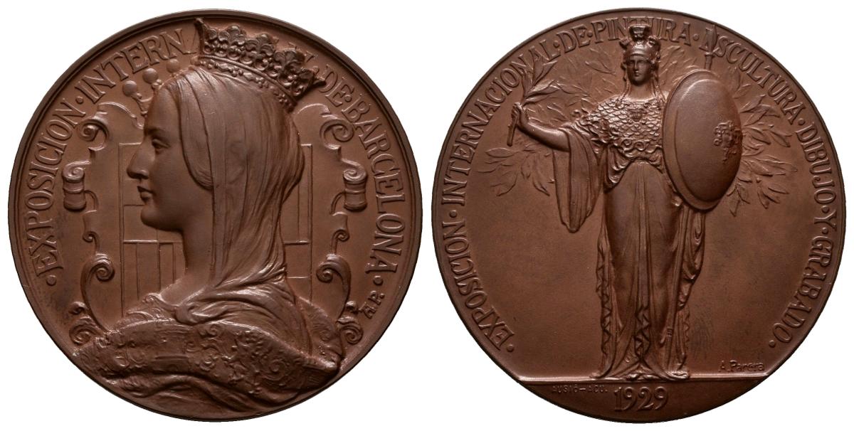 ALFONSO XIII (1885-1931). Exposición Internacional de Pintura, Escultura, Dibujo y Grabado. (Ae. 71,04g/49mm). 1929. Barcelona. Grabadores: A. Parera y E. Ausió. SC. Incluye estuche original de E. Ausió.