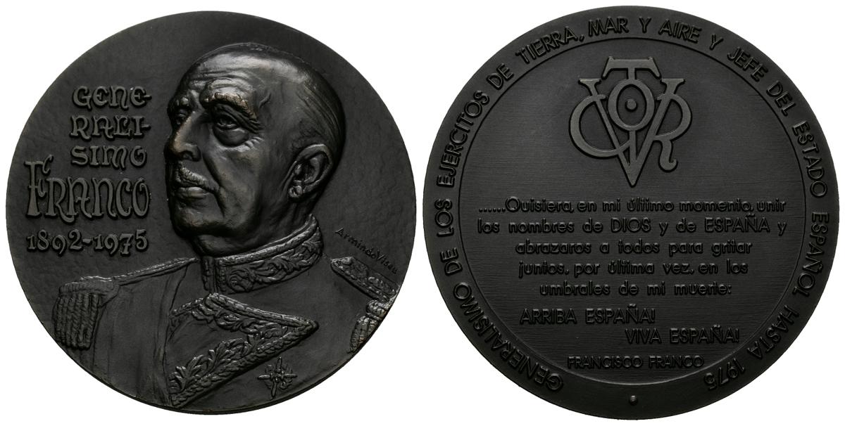 ESTADO ESPAÑOL (1939-1975). Generalísimo Franco (1892-1975). (Ae. 84,80g/59mm). 1975. Grabador: Armindo Viseu. En el canto Gravarte-Lisboa-Portugal. 243/1000 (ejemplares). EBC+. Escasa.