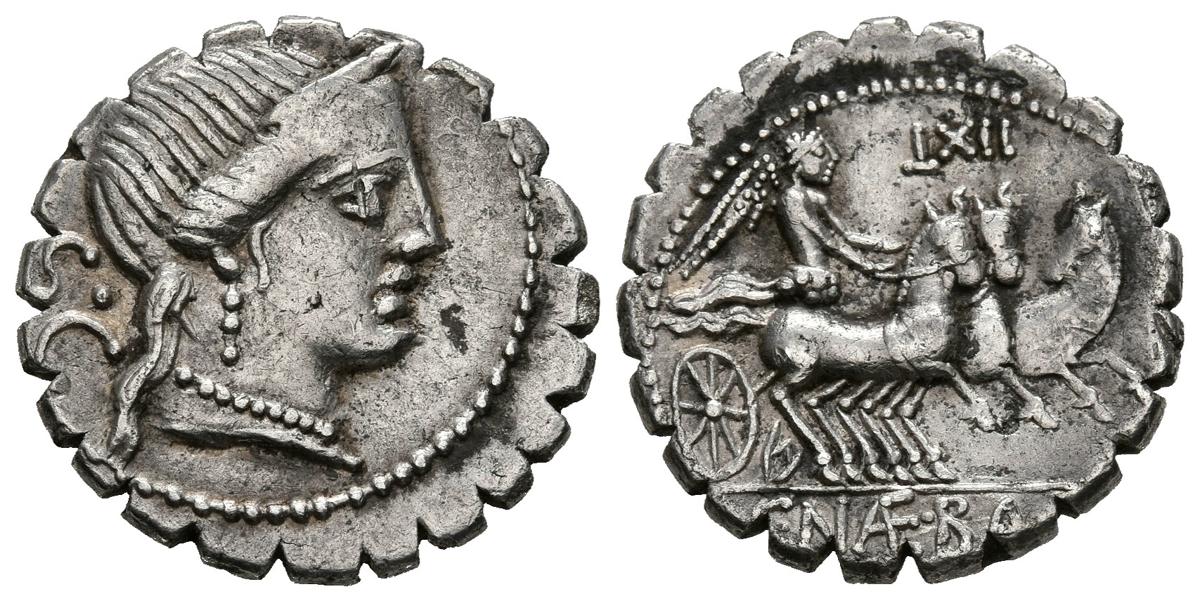 GENS NAEVIA. Denario. (Ar. 3,69g/18mm). 79 a.C. Taller auxiliar de Roma. (FFC 937; Crawford 382/1). Anv: Cabeza diademada de Venus a derecha, detrás SC. Rev: Victoria en triga a derecha, encima numero: LXII, en exergo: C NAE BALB. MBC.