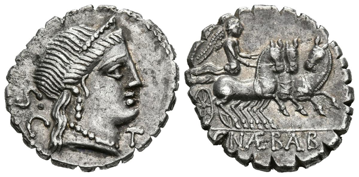 GENS NAEVIA. Denario. (Ar. 3,60g/19mm). 79 a.C. Taller auxiliar de Roma. (FFC 393; Crawford 382/1a). Anv: Cabeza diademada de Venus a derecha, detrás SC, delante letra. Rev: Victoria en biga a derecha, en exergo: C NAE BALB. EBC-.
