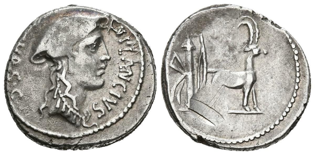 GENS PLANCIA. Denario. (Ar. 3,78g/18mm). 55 a.C. Roma. (FFC 991; Crawford 432/1). Anv: Cabeza de Diana Planciana a derecha, alrededor leyenda: CN PLANCIVS AED CVR SC. Rev: Cabra a derecha, detrás carcaj y arco. MBC. Golpe en reverso.