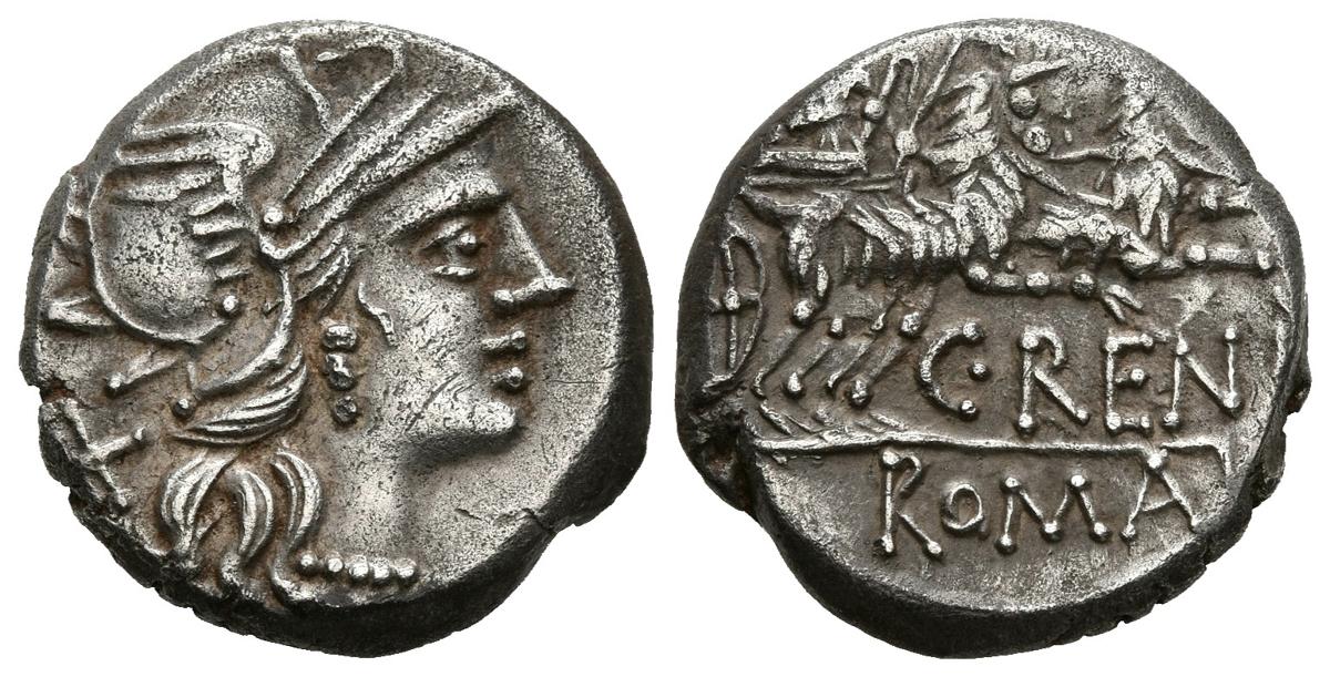 GENS RENIA. Denario. (Ar. 3,72g/16mm). 138 a.C. Roma. (FFC 1088; Crawford 231/1). Anv: Cabeza de Roma a derecha, detrás X. Rev: Juno Caprotina en biga de machos cabríos a derecha, debajo leyenda: C RENI, en exergo: ROMA. MBC+.