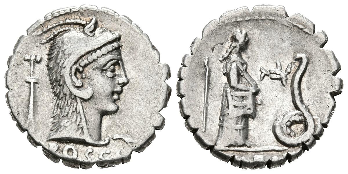 GENS ROSCIA. Denario. (Ar. 3,84g/17mm). 64 a.C. Italia central. (FFC 1090; Crawford 412/1). Anv: Cabeza de Juno Sospita tocado con piel de cabra a derecha, detrás símbolo, debajo leyenda: L ROSCI. Rev: Muchacha dando de comer a una serpiente en el campo símbolo, en exergo: FABATI. MBC+.