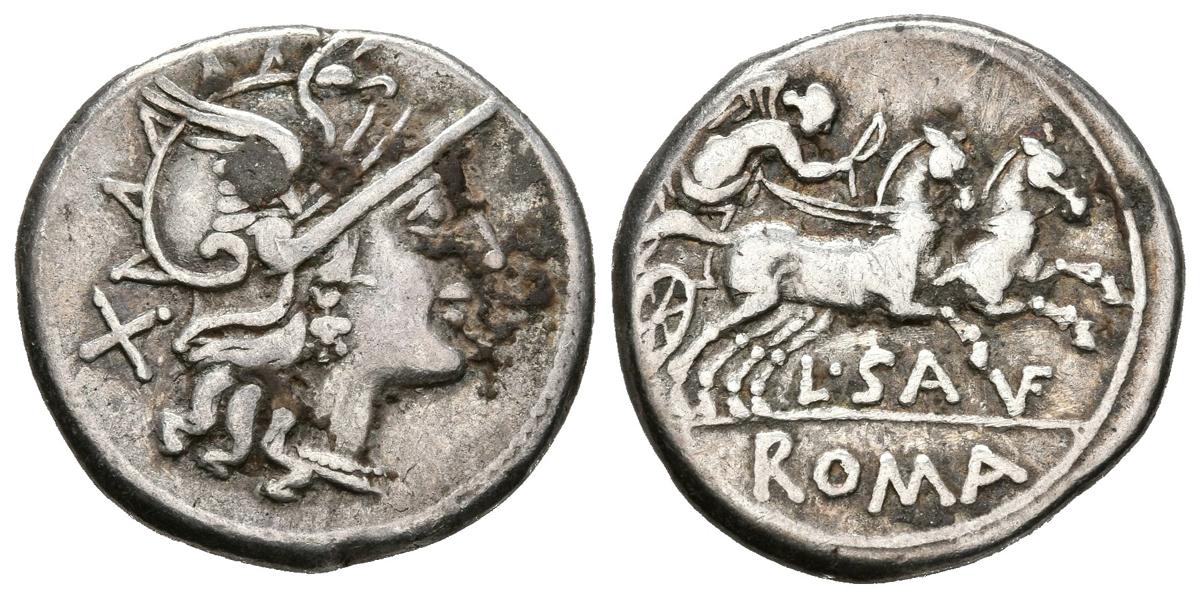 GENS SAUFEIA. Denario. (Ar. 3,95g/19mm). 152 a.C. Roma. (FFC 1099; Crawford 204/1). Anv: Cabeza de Roma a derecha, detrás X. Rev: Victoria con corona en biga a derecha, debajo leyenda: L SAVF, en exergo: ROMA. MBC-.